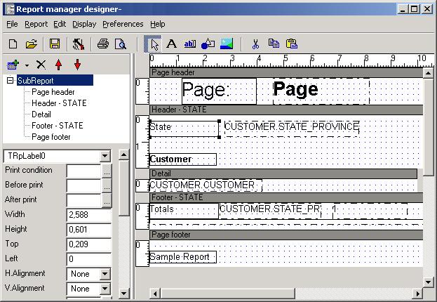 | Sections | A Subreport contains sections (bands), the most common section type is detail, but other are page headers, page footers and group headers and footers. The engine will print page headers and footers as necessary, it will check group changes, print group headers and footers and print the detail type sections for each record of the dataset assigned to the subreport. A section have useful properties like print condition, align bottom, horizontal displacement etc... |
