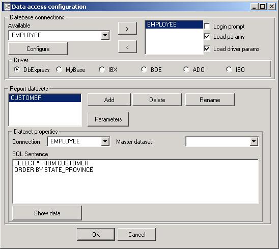 | Datasets | Datasets are optional but a report usually prints data stored in datasets, the datasets are opened at the beginning of the process, you can open several datasets and establish relations between them |