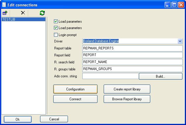 It's recommended you create the library from this dialog, after testing the database connection, a library consists in two tables, the reports table and the groups table. In the report table the reports and report descriptions are stored, the groups table is needed to store the tree structure of the library. You can browse the library after the creation.